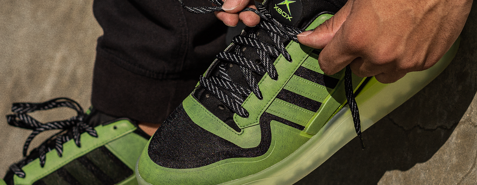 The collab features an exclusive new adidas Originals by Xbox sneaker — the Xbox 20th Forum Tech — with translucent green details inspired by the special edition release of the original Xbox console for the launch of Halo: Combat Evolved in 2001.
